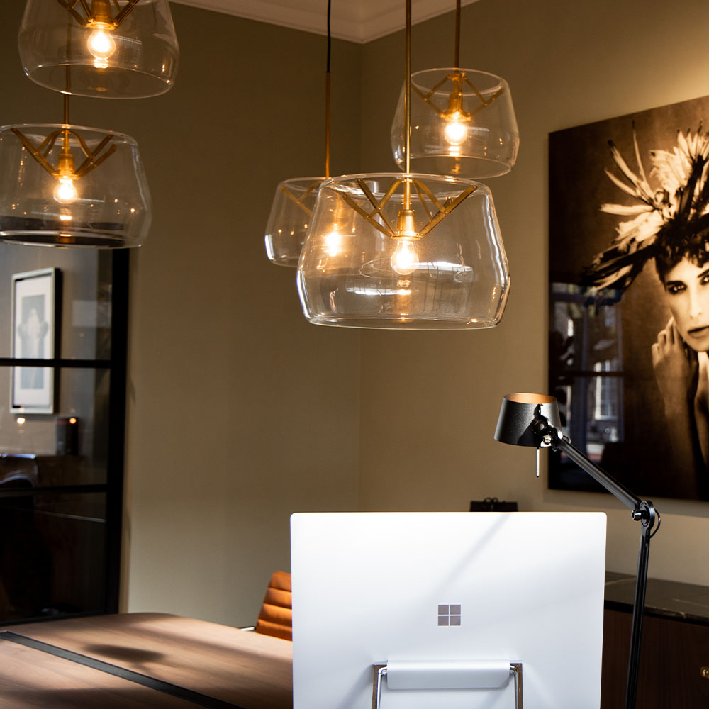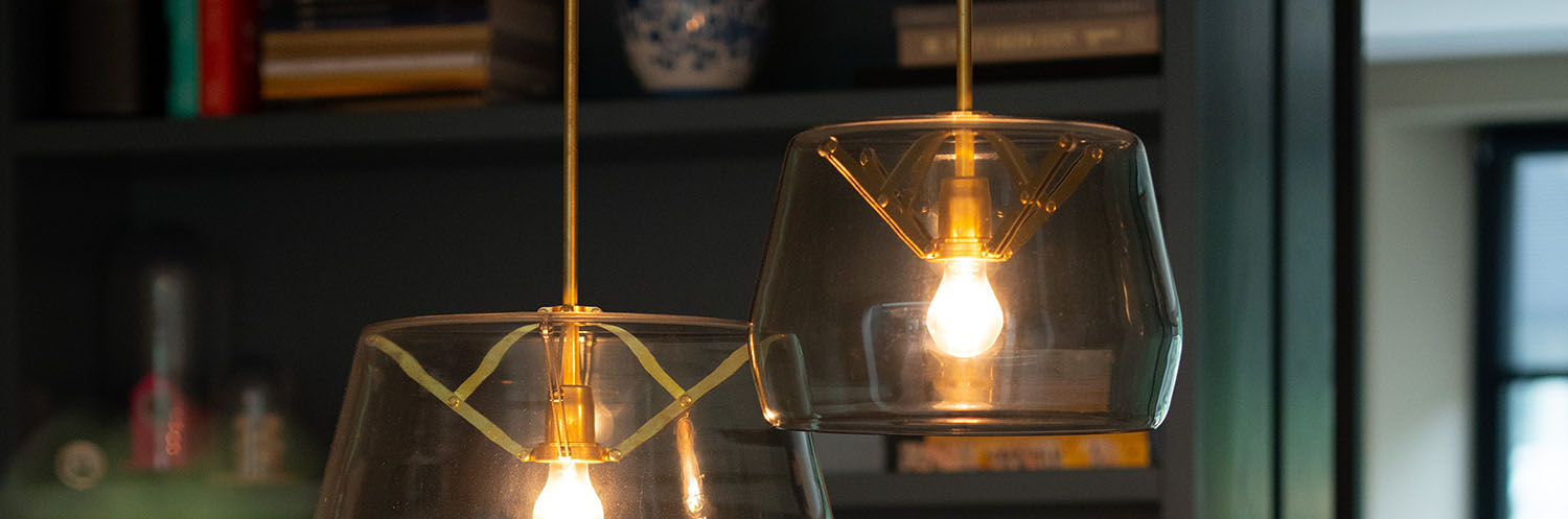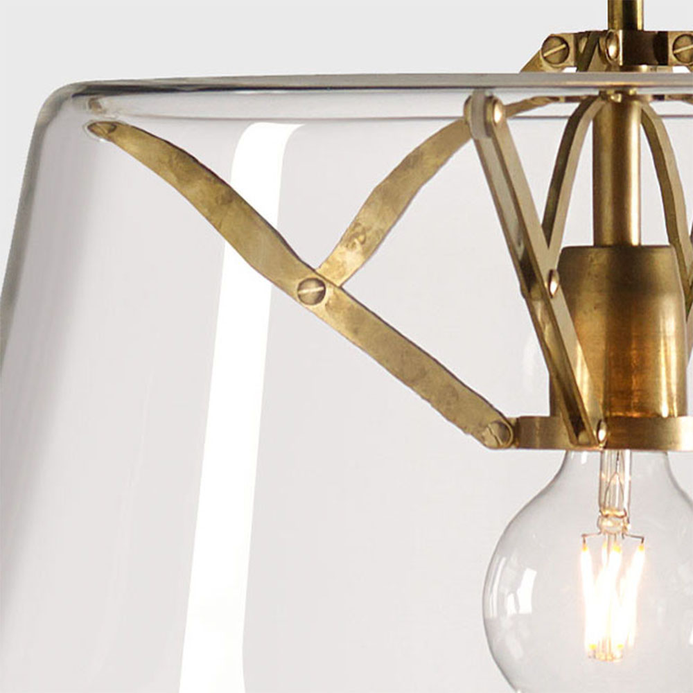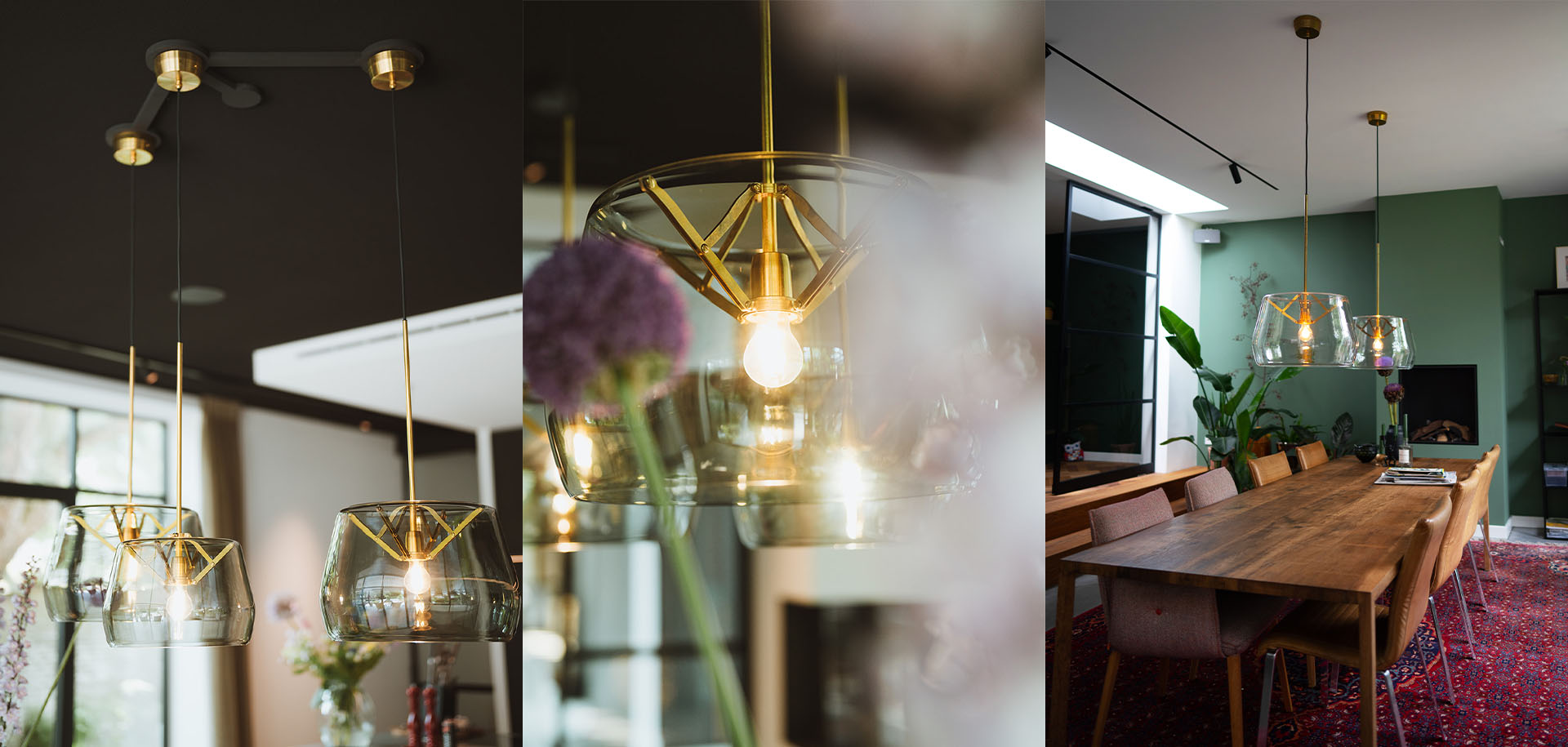 Atlas is an industrial yet very elegant pendant lamp. The combination of a brass hinge mechanism with a transparent, mouth-blown glass shade creates a structural lamp with a poetic character. The glass provides a natural and pleasant diffusion of light, allowing it to shine evenly and atmospherically in the room.