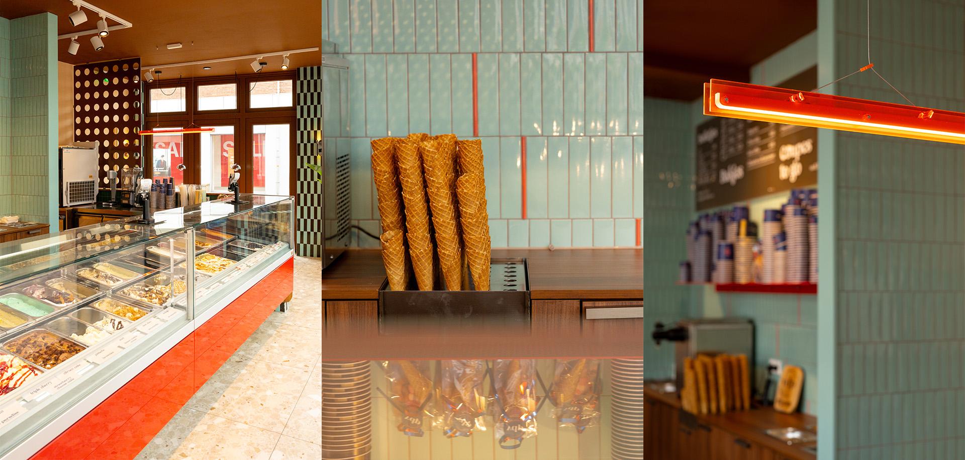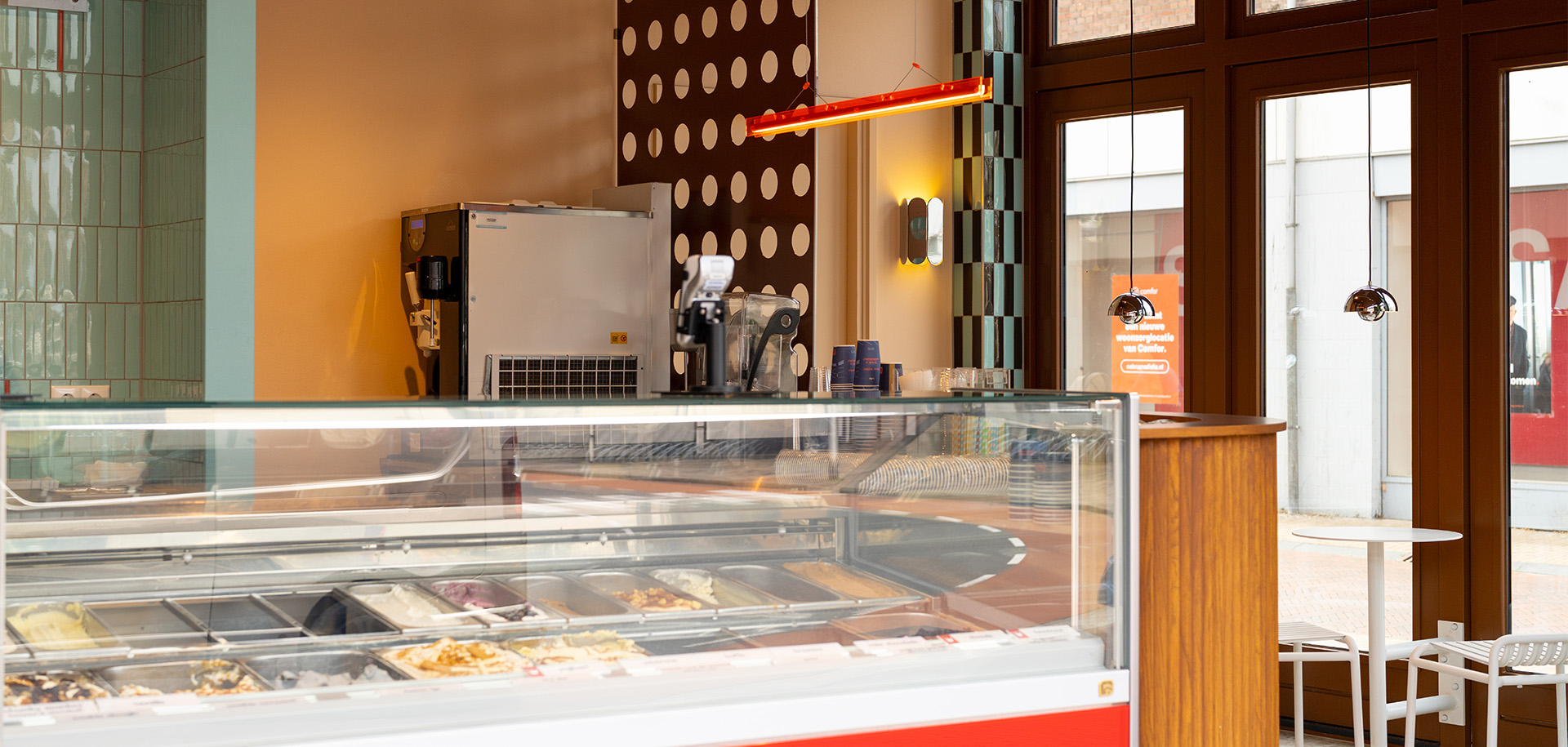 With patterned tiles, playful contrasts, and a warm color palette, the result is a joyful setting that makes enjoying an ice cream an even richer experience.