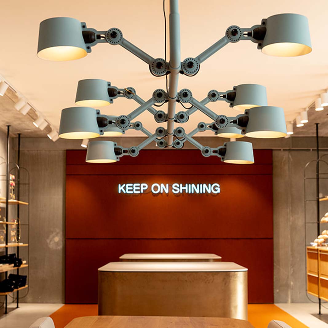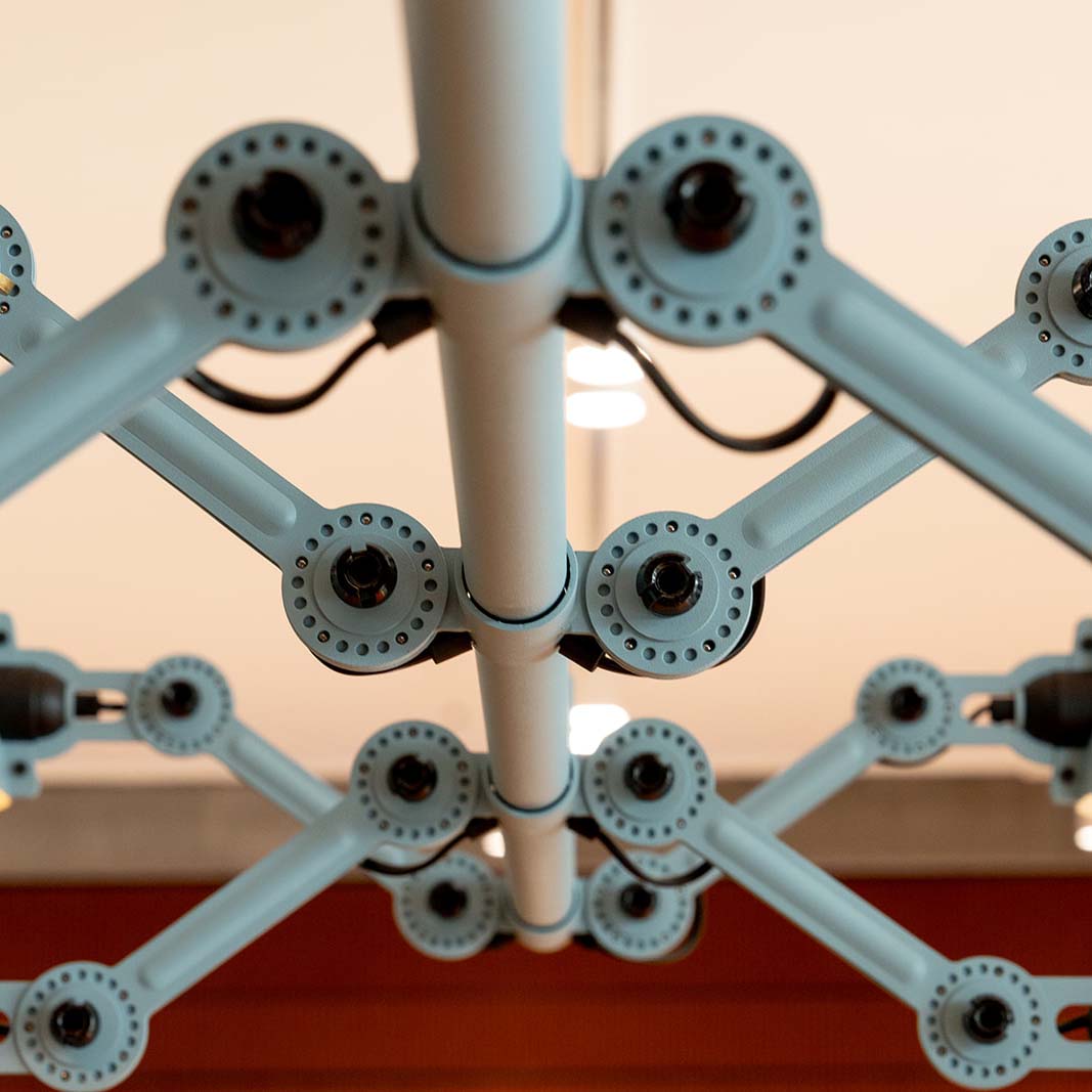 The 10-Pack Pendant is characterised by a frame with 10 adjustable powder-coated steel arms and powder-coated aluminium shades.