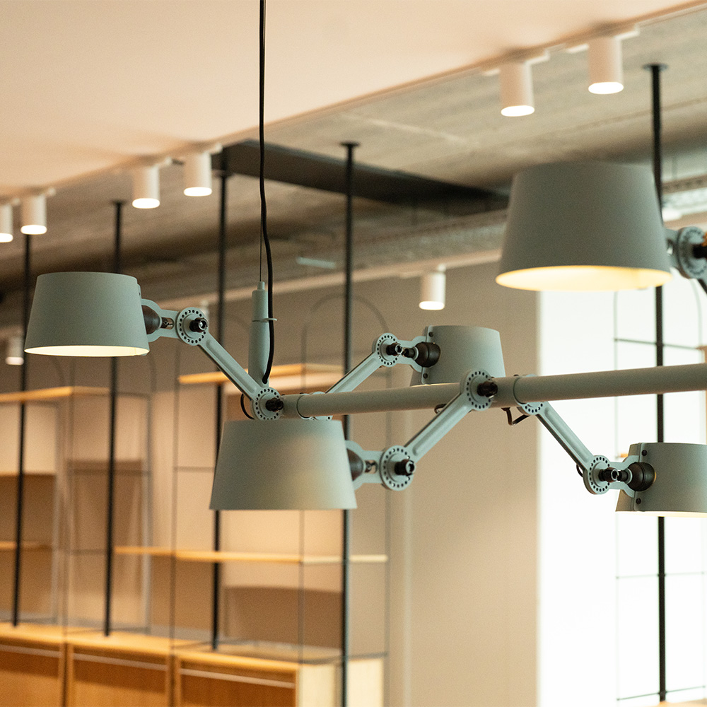 De hanglamp kenmerkt zich door een frame met 12 verstelbare armen in gepoedercoat staal en kappen in gepoedercoat aluminium. De open kappen zorgen voor een mooie verspreiding van het licht.