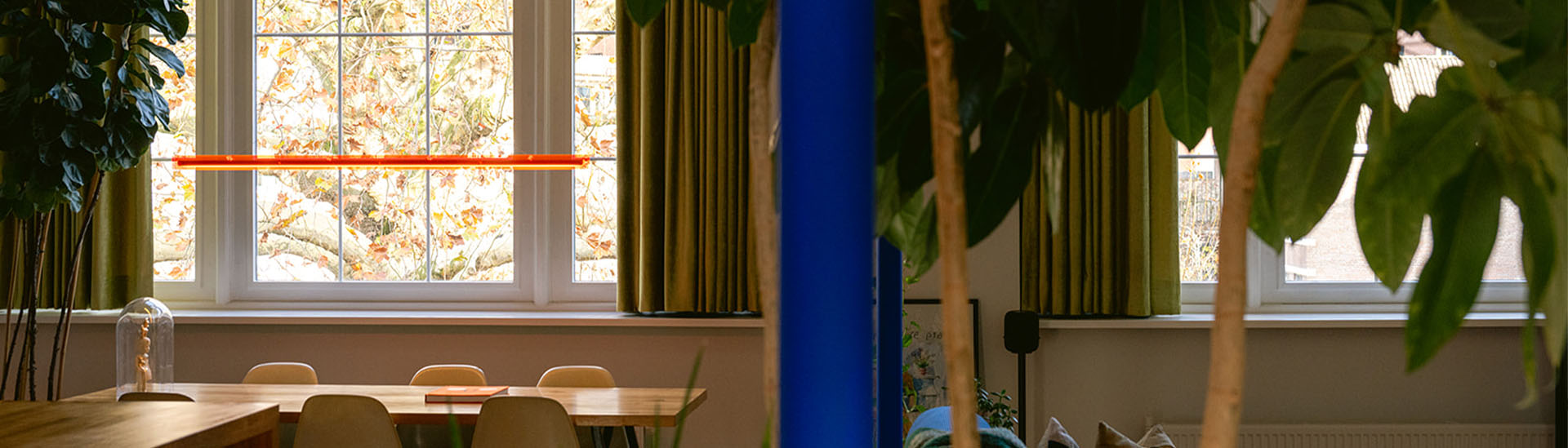Kleur speelt hier de hoofdrol. Diepblauwe tinten, zachte perzikkleurige tegels en groene gordijnen werken samen als een vrolijk orkest. Tussen de vintage vondsten en designstukken is er altijd iets dat een glimlach oproept. En boven de eettafel steelt Bridge in Lava Orange van Tonone de show.