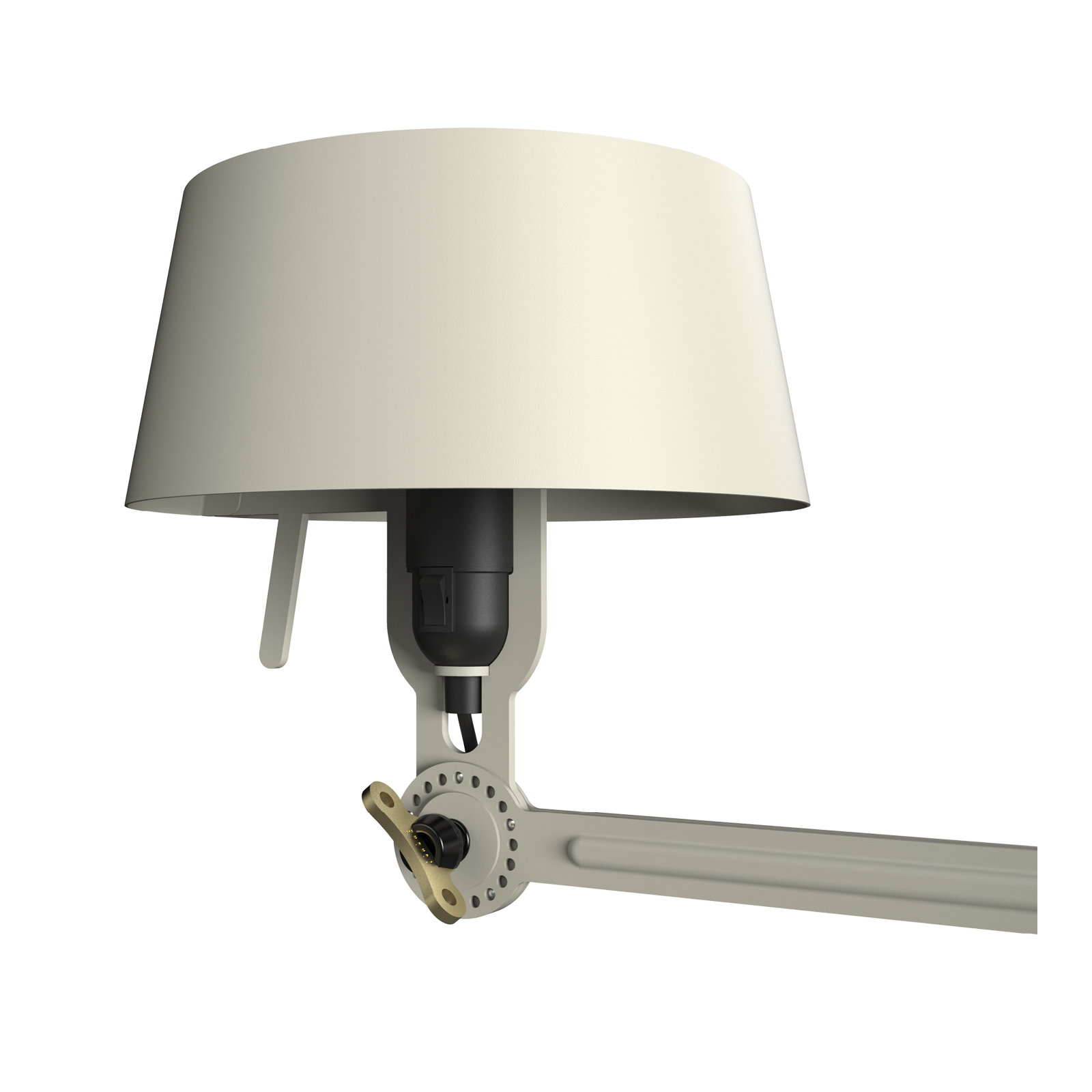The open shade ensures a nice distribution of light. The solid brass wingnut is included to adjust the hinges as desired. In addition to being a functional aid, the wingnut is integrated into the design of the lamp and is a distinctive visual element of the lamp. The bedside lamp also has a hinge on the wall plate, which allows it to swivel horizontally. The switch is located on the fitting.